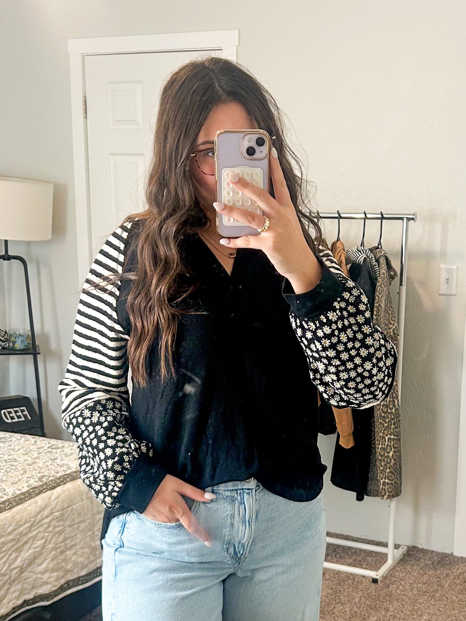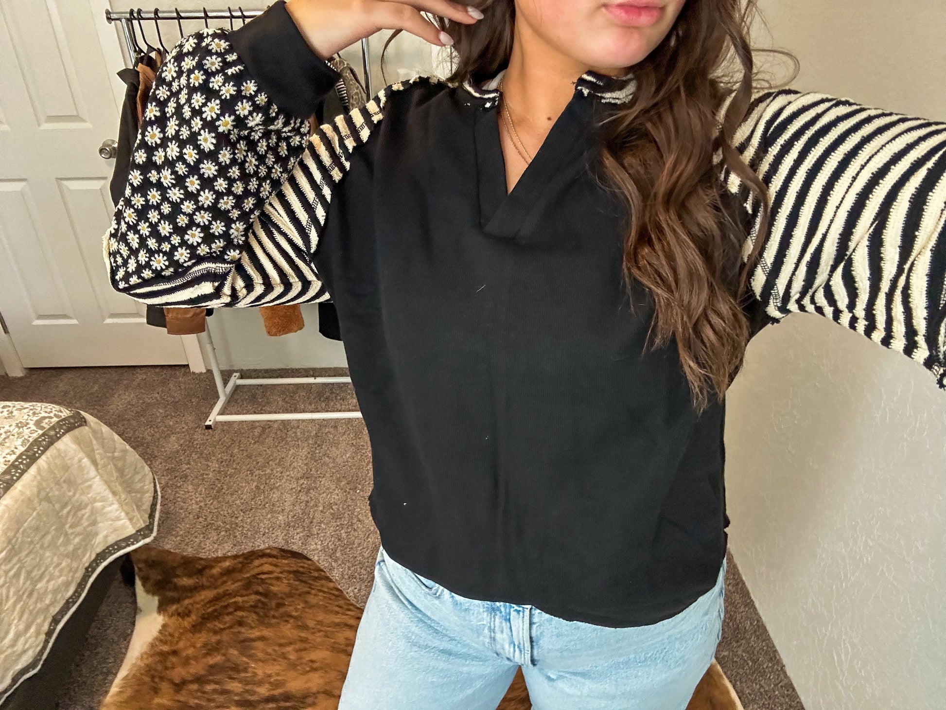 - Oversized Floral & Stripe Casual Knit Top - Split Neck - Long Sleeve - Raw Edge Detail - Round Hem